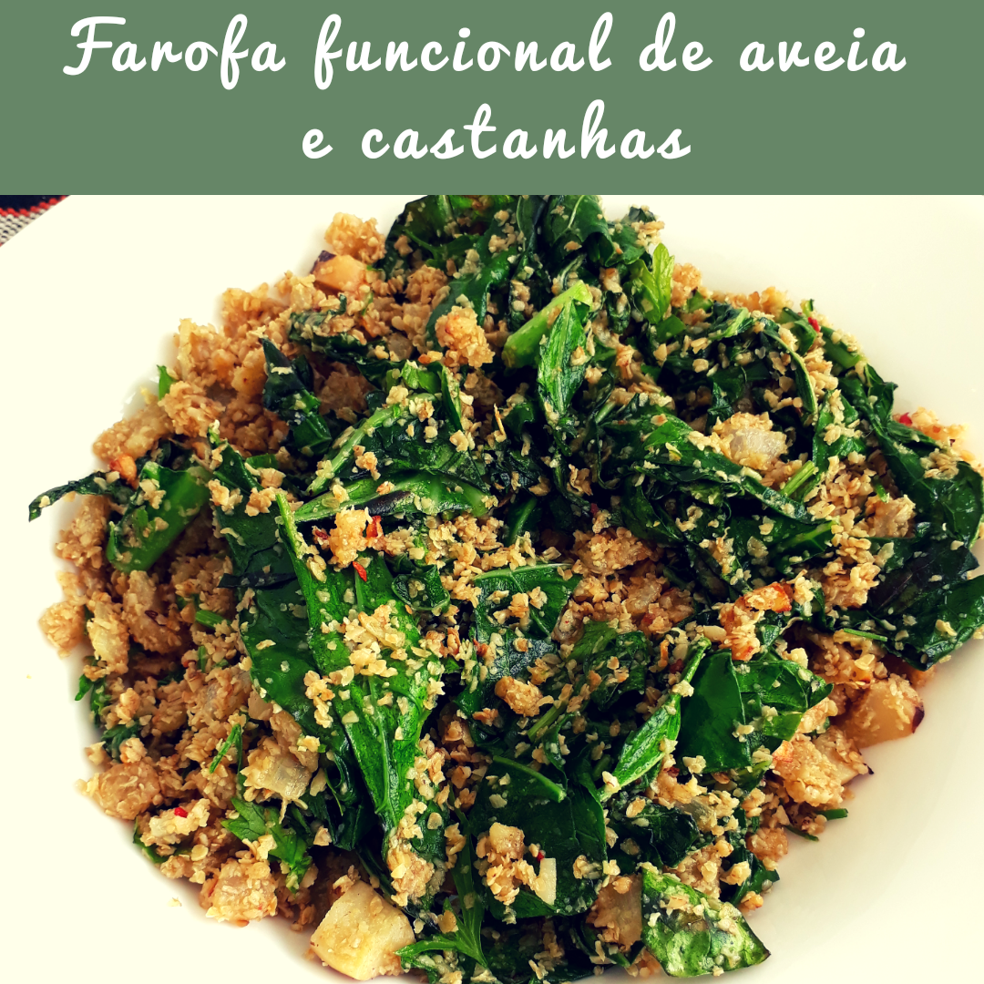 Em outra frigideira, aqueça o restante do azeite e acrecente a couve cortada em tiras. Refogue por 2 minutos e tempere em seguida. Refogue por mais 1 minuto e inclua a farofa da aveia.