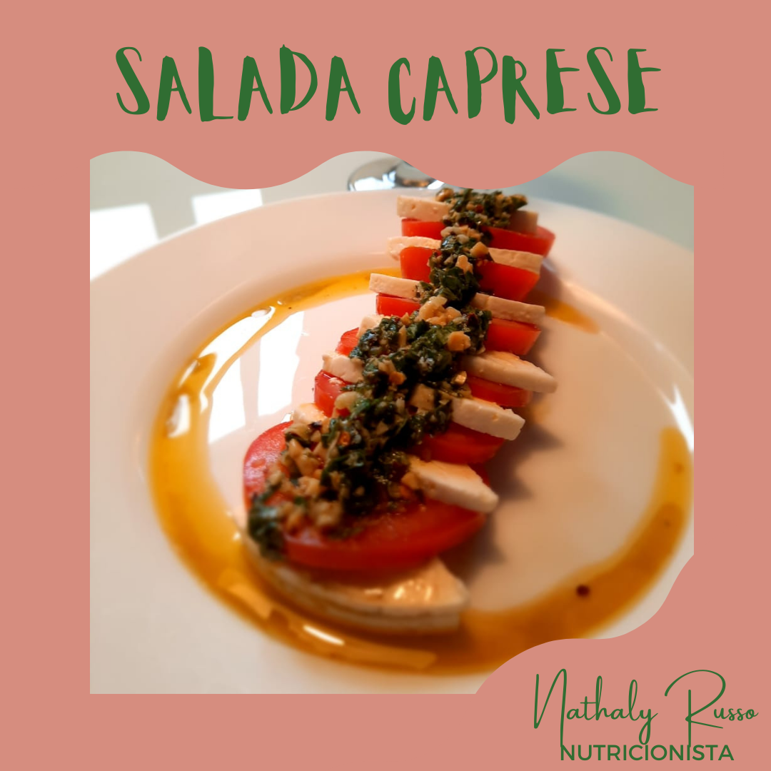 - em um prato ou travessa, intercale as fatias de tomate com o queijo e depois coloque o molho pesto por cima.