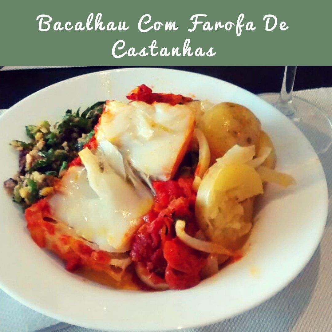 Cozinhe as batatas por 10 minutos na água salgada, escorra e reserve. Em uma frigideira, esquente 1 colher de sopa de azeite e acrescente a cebola picada, o alho poró, alho e pimenta dedo de moça, refogue. Junte os tomates e o açafrão e deixe cozinhar por mais 10 minutos. Tempere e coloque mais um pouco de azeite. Regue com azeite uma travessa de vidro e disponha as batatas, tempere-as. Acrescente a cebola fatida por cima. Coloque o bacalhau e regue com o molho de tomate. Coloque uma folha de louro em cima de cada posta. Coloque no forno a 180 graus por 15-20 minutos. Para a farofa, misture a salsa, farofa de milho, castanhas, azeitonas, limão e sal.